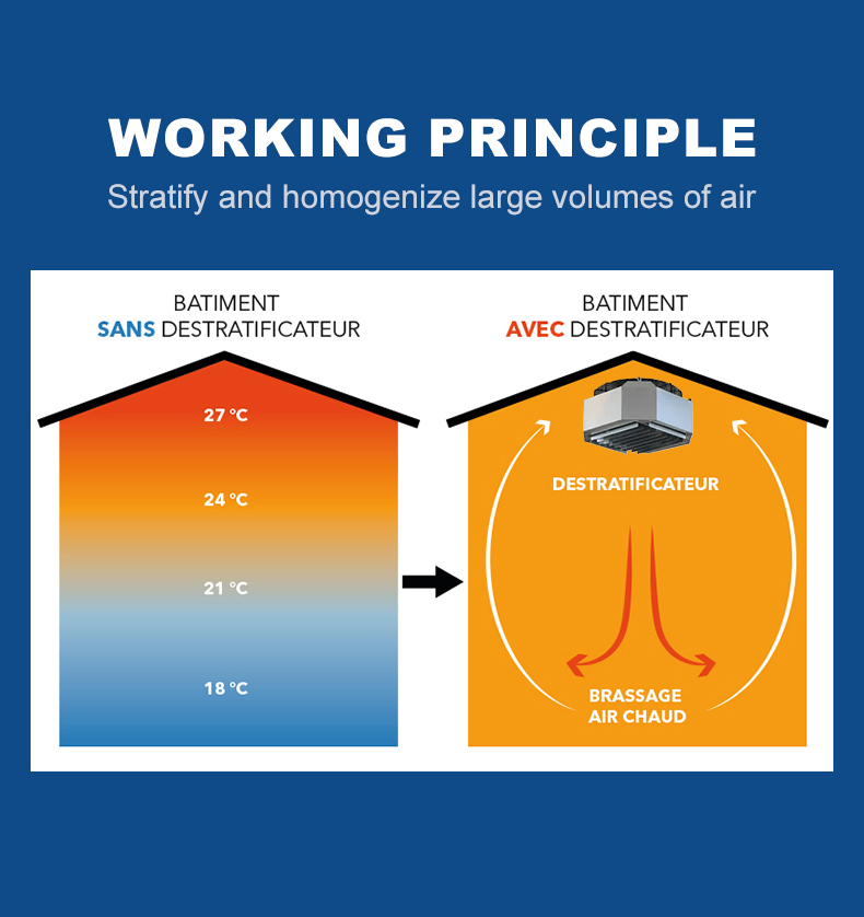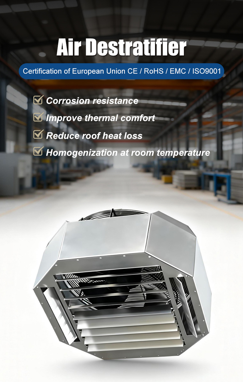 Air destratifiers are designed to redistribute heat accumulated at height to occupied areas, eliminating temperature differences and reducing heating costs by up to 30%.