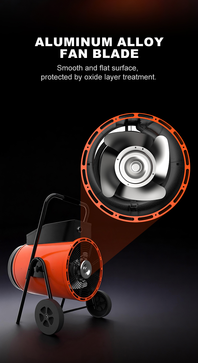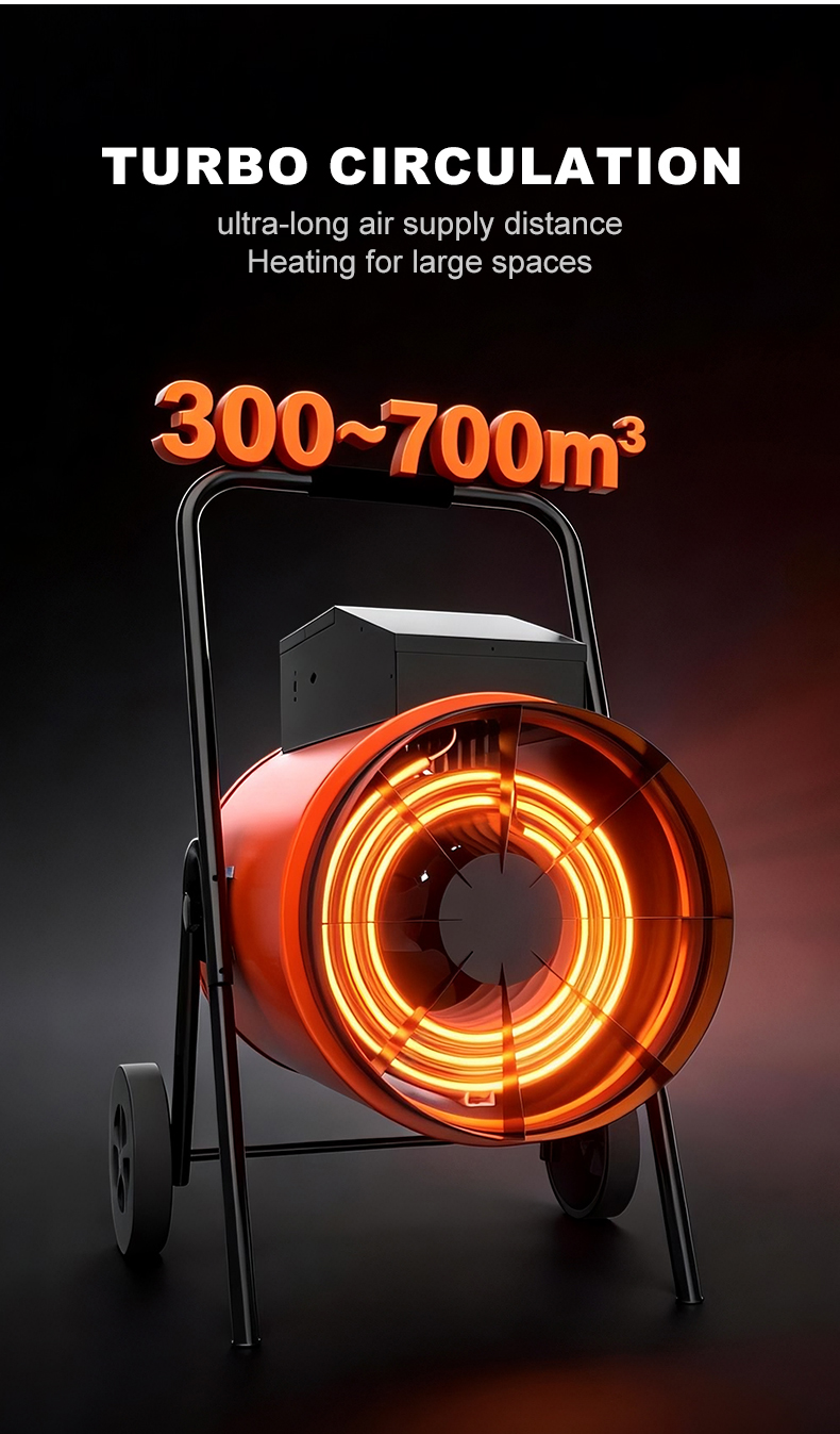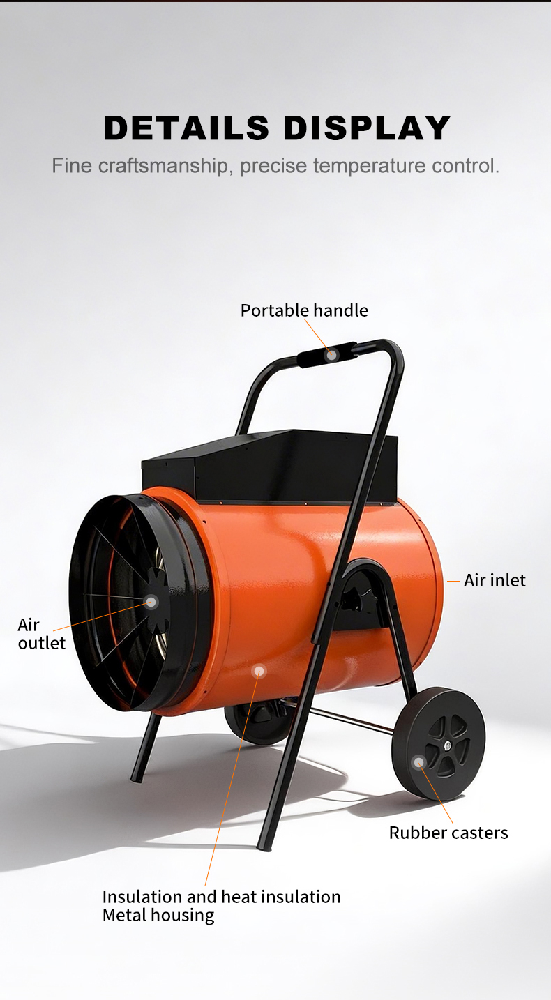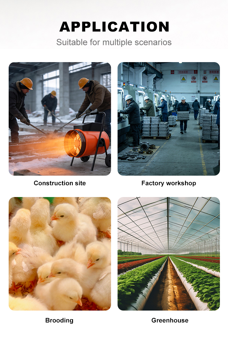 This equipment is suitable for a wide range of uses. It is ideal for heating or preventing freezing in ventilated commercial spaces. It can also serve as supplementary or intermittent heating in workshops, warehouses, or milking parlors. In construction and agriculture, the electric hot air cannon is particularly effective for drying, providing fast and reliable results.